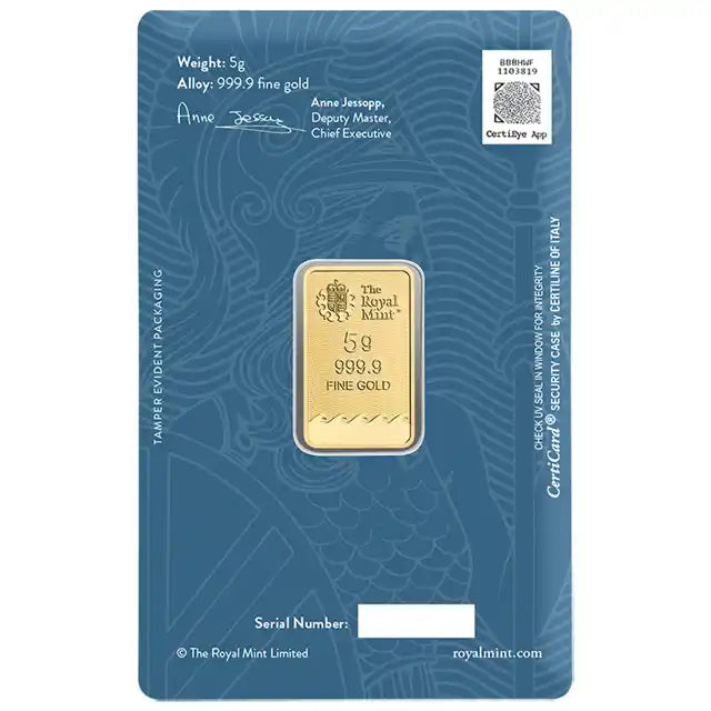 This Pre-Owned The Royal Mint Britannia 5g Gold Bar is a compact and affordable way to invest in .9999 fine gold (24 carat). Minted by The Royal Mint, one of the oldest and most trusted mints in the world, the bar features the classic Britannia design, symbolising strength, integrity, and national pride.